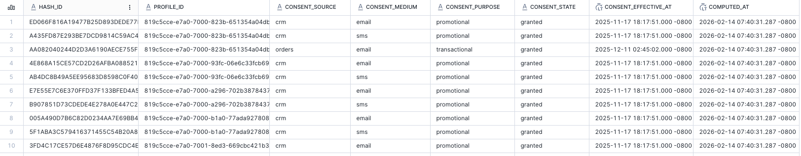 **Consent*****:*** a transformation module that creates a unified privacy consent fact table by consolidating consent data from multiple source systems with inconsistent formats. It implements configurable conflict resolution using precedence rules (typically: denied > unknown > granted) to create a single source of truth for customer consent while supporting both explicit consent columns and implicit consent inferred from transactional events. In SPAN consent is organized based on where did the consent come from (consent source), where will direct communication be delivered (consent medium), and purpose (is messaging promotional or transactional?). Consent is the only artifact generated by Compiler with a strict data schema.