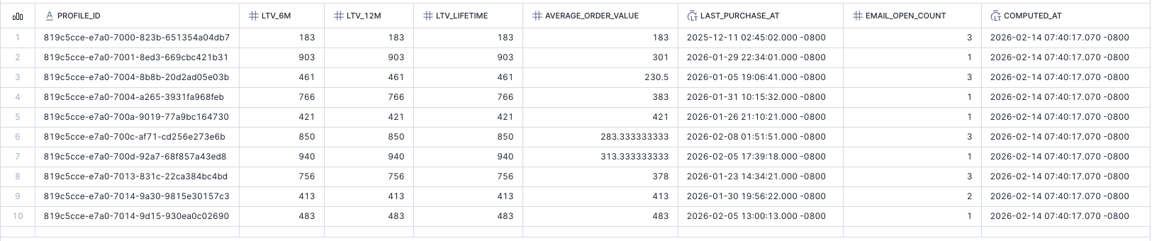 **Metric***:* a transformation module that calculates a unified table with one record per `PROFILE_ID`  by combining rolling-window metrics calculations with aggregation methods. Source fact tables (transactional events like orders, ticket purchases, and newsletter signups) are used to calculate all metrics. This table answers: *What did this customer do over time?* e.g. lifetime value (LTV), purchase frequency, recency. Metrics are also used as pre-computed KPIs for segmentation, targeting, and reporting. The user has full control over what metrics to include and how they should be calculated.