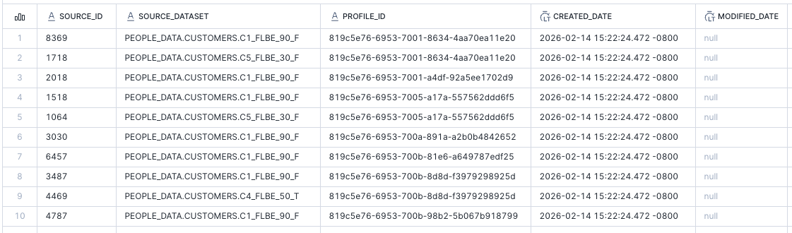 * `MODIFIED_DATE`: \[TIMESTAMP] Last date/time when the identity was changed - new source record added, source record removed&#x20;